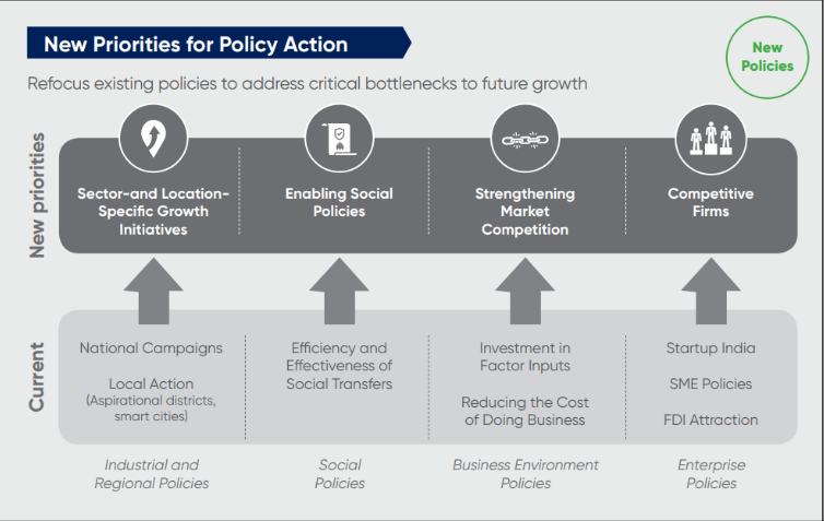 The set of solutions for growth revolves around the creation of competitive jobs. These will earn wages for the employees, support livelihoods and provide further opportunities for development. Higher skills would automatically enable higher wages as the replacement cost of the employee to the firm will rise. This calls for reforms on several levels, such as propagation of the required and desired skills to the population, revolutionising the industry and businesses etc. The next focus will be on generating competitive firms. Jobs have to be created, and more importantly, the jobs created should be sustainable. The business sector has to be reframed to enable the MSMEs to provide sustainable employment. Sector and Region-specific reforms and policies are required to identify unique and typical needs of the concerned sector to develop it and equip it for a higher level of competitiveness. Furthermore, better dialogue and collaboration are required between the public and private sectors. Such partnerships are cardinal in both affordable and high-quality services.