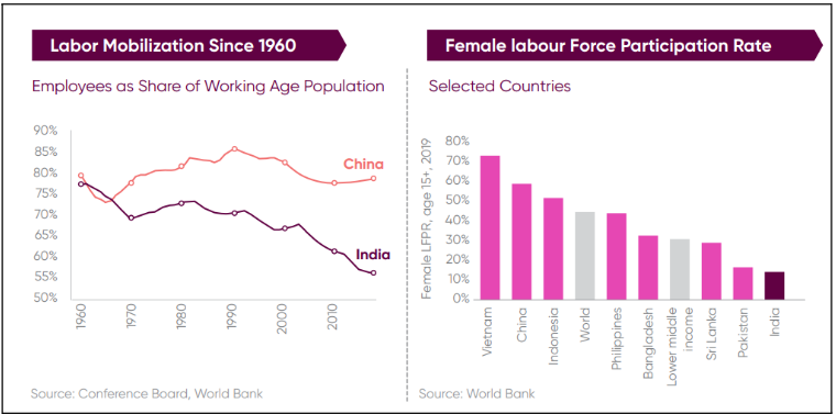 Logic dictates that to correct something and solve an issue, one must understand it first and comprehend where things are going down the hill (or may potentially go). This assertion is upheld while dealing with economic problems as well. To reverse what might seem like a downward trajectory of the economy, one has to determine and scrutinise the chain of causality and identify the specific events (political, geo-political, natural etc.) and policy shortcomings that might be the reason behind the economic downfall. Even if the economy isn’t treading a downward trajectory, problems exist pertaining to the common economic intuition that no economy operates at its full potential and there is always room for development. On similar and parallel lines, EAC-PM, while devising the roadmap for India@100, first considered identifying and analysing the problem holding our economy back. These problems can be referred to as ‘3+1’ problems, with regards to the fact that three of these are endogenously rooted, and the remaining one is exogenous. A particular problem with the Indian economy is that its performance is impressive in more sophisticated dimensions of competitiveness, but it lags in the essential fundamentals. This includes basic infrastructure, availability of a highly skilled labour force and the ease of doing business. Therefore, the business aspects based on sophisticated technology and processes based out of India are doing well on the global front ( majorly the service sector), whereas the parts reliant on basic business processes are lagging, unable to realise their potential. Though essential services are being provided, for example, electricity and education, these qualities is not up to the mark and cannot meet the required standards. Although policy upgradation has taken place appropriately, their benefits to the economy are cut down due to inefficient implementation and the cross-purpose works by concerned individuals. Struggling with fundamental problems and fighting against poverty, malnutrition, insurgency, communal polarisation etc., the Indian approach to the economic bloom often fails to acknowledge and recognise the dynamically evolving reality of the global economy. 3+1 Problems we face: 1. The Challenge of Shared Prosperity: Though India is now the world’s fifth largest economy, the impressive GDP growth has not benefited all Indians equally. Serious income inequality exists in India. The disparity also exists among regions and sections of society. This was highlighted by the fact that post covid recovery of the Indian economy has been a K-shaped curve, with inequalities rising. The benefits of GDP growth not seeping to the lowest level is a concerning factor and will further widen the gap between the rich and the poor. 2. The Challenge of Jobs: India has one of the most impressive and promising demographic dividends globally. With the largest youth population in the world, India’s 66% population is below the age of 35. In contrast to nations such as Japan and South Korea, these figures are a ray of hope for the economy. However, a peculiar problem of ‘ Jobless Growth’ exists. A significant number of the youth do not work, so the nation cannot realise its potential. This problem can be rooted in the inefficient sectoral transformation post-1991. The economy jumped directly from reliance on the primary sector to the tertiary sector, and the manufacturing sector was relatively unequipped to accommodate the less skilled labour released from agriculture. Another problem exists in the participation rate of women. The participation rate of women graduates is less than 25%. Also, the participation rate is lower for educated youth than for uneducated youth. As of 2021, only 23.5% of female graduates are working, whereas the number of male graduates is 72.1%. The worker-Population ratio for the non-literate population is 53.6%, whereas it is just 51.8% for the literate population.